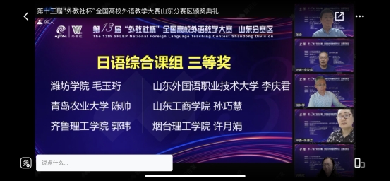 5月21日,第十三届“外教社杯”全国高校外语教学大赛山东省决赛在云端落幕。烟台理工学院参赛教师、团队在大赛四个组别的赛事中取得历史性突破,获得特等奖一项,一等奖一项,三等奖两项。我校教师徐家南荣获(视)听说课组特等奖,并将于年底作为山东省唯一代表参加该组别的全国赛;于巧丽团队荣获英语思政微课组一等奖;许月娟和过春燕分别荣获日语综合课组和英语综合课组三等奖。