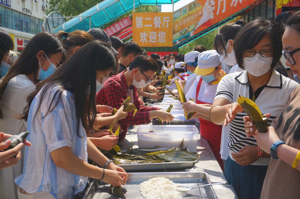 活动当天,众多师生摩拳擦掌,积极参加各项端午项目活动。汉语言文学专业的李新雪参与了本次手工包粽子活动。“这个活动很有参与感与仪式感,能够有机会吃到自己亲手包的粽子,非常有成就感。我们也是‘别人家的学校’了!”今天还是机械设计制造及其自动化专业袁文鹭同学的生日,他说:“一边过节日,一边过生日,这是双倍的快乐!”