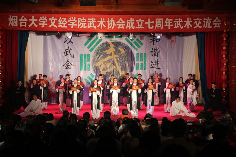 武术是传统文化的优秀代表,七年,我院传统武术文化的传播效应显著。11月27日晚,我院武术协会成立七周年武术交流会在一教207多功能厅成功举办。学院办公室主任史毅,机电工程系主任刘加光,管理系党支部书记张琼玉及各系主任、党支部书记、副书记,体育教学部主任王开文,院兼职教授、武术协会执行主席兼秘书长孙翠梅,烟台莱山太极尚府演武堂总教练曲玲及学院相关教师出席本次晚会。