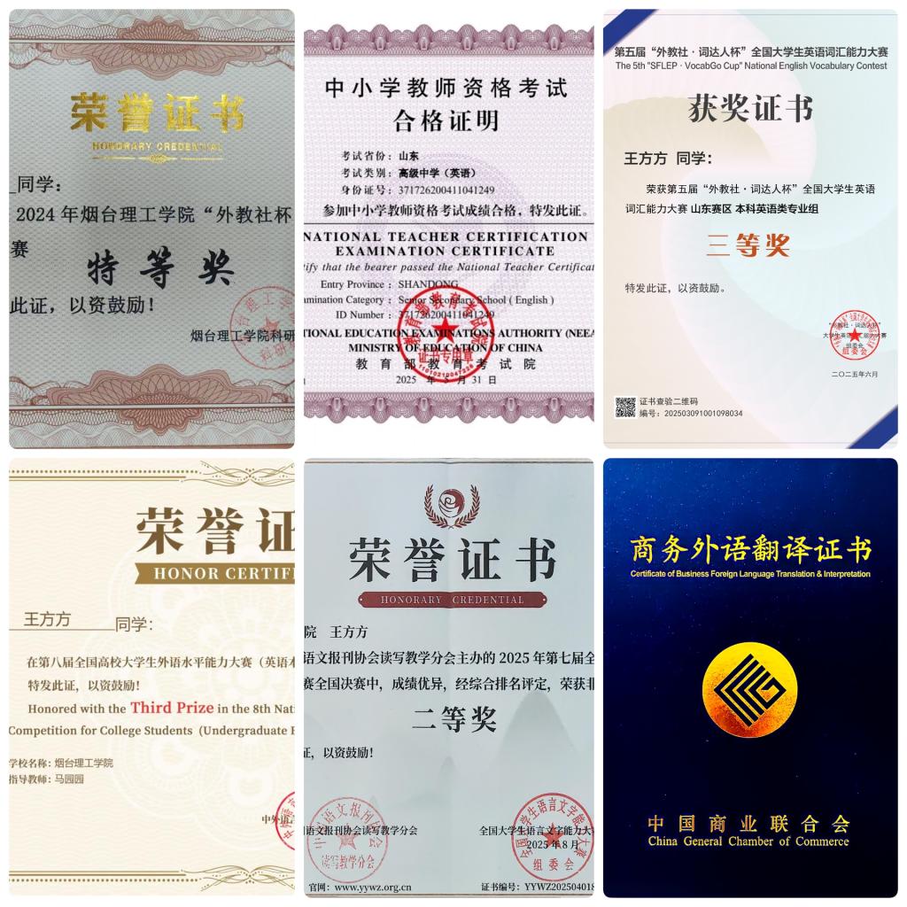 大学期间考取了上海外语高级口译证书、外研社·国际人才英语考试证书(国才)、外教社·全国跨文化能力证书、高中英语、语文教师资格证、计算机二级等级证书。学科竞赛领域,她以赛带练,以赛促学,正是这种要在自己认为值得的事情上拼尽全力的劲头,让她获得省级及以上奖项十余项,总计36项荣誉。包括专业类竞赛,如全国跨文化能力竞赛国赛二等奖(5%-10%)、省赛一等奖(2%-5%);“外研社·国才杯”国际传播力短视频大赛全国海选一等奖(15%);全国高校大学生外语水平能力大赛(英语本科组)三等奖;“外教社·词达人杯”全国大学生英语词汇能力大赛-专业组三等奖(20%)、校赛特等奖两次;“CATTI杯”全国大学生翻译大赛复赛三等奖(30%)。